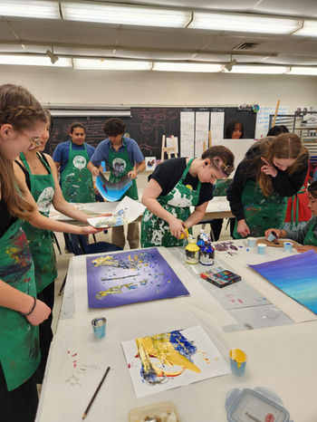 La peinture abstraite, c'est facile, non? En passant à l'action, les élèves ont découvert l'importance de la collaboration, de la recherche visuelle, de l'expérimentation, et de la pensée divergente afin de créer ces œuvres en grand format en groupes de deux.